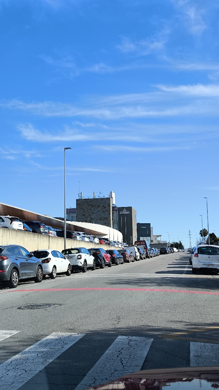 The image displays an outdoor urban street scene in Barberà del Vallès, Spain, under a clear blue sky with thin, cirrus clouds. The foreground features an asphalt road with a white pedestrian crosswalk marked by parallel stripes, and a horizontal red line painted further down the road. A metal manhole cover is visible on the pavement. A continuous line of parked automobiles extends along the left side of the road, situated on an elevated concrete structure or parking lot. These vehicles include multiple SUVs, hatchbacks, and sedans in various colors such as silver, white, red, dark blue, and black. A tall, grey street light pole stands prominently on the left. In the background, a multi-story commercial or office building complex is visible. This complex features a section with dark, irregular stone cladding and other sections with dark, smooth facades. A sign on one of the buildings reads "MAZEL BARCELONA," with a partially visible "Barberà" below it, confirming the location. Another building displays a green corporate logo. Further down the road on the right, another line of parked vehicles is visible, including a white hatchback with the Spanish license plate "7266 HSJ." Utility poles with power lines are present on the distant right horizon. The perspective suggests the photograph was taken from inside a vehicle, as indicated by a reflection along the bottom edge of the frame. No individuals are present in the depicted scene.