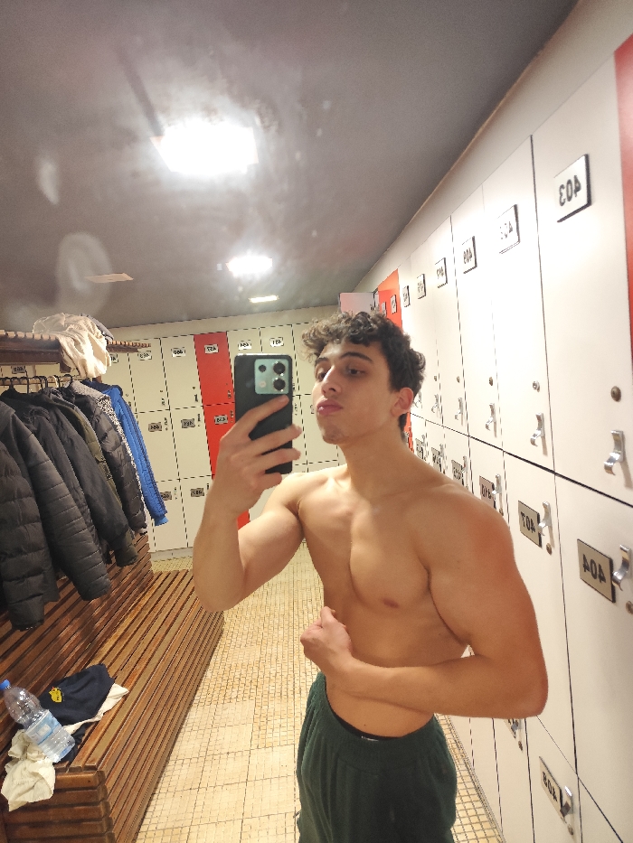 A shirtless young man takes a selfie in a locker room