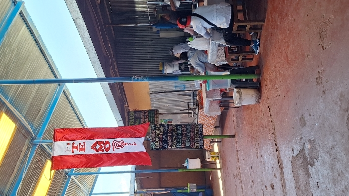 The image presents a semi-enclosed, outdoor dining area, consistent with a market or food court in José Luis Bustamante y Rivero, Peru, under clear daylight