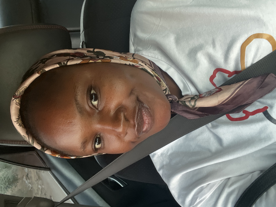 A woman with brown skin wears a floral headscarf and a white t-shirt. She is buckled into a car seat, a gray seatbelt strap across her chest. Her gaze is directed slightly downward and to the side. The t-shirt design includes orange and red curved shapes. The background shows glimpses of the car interior.