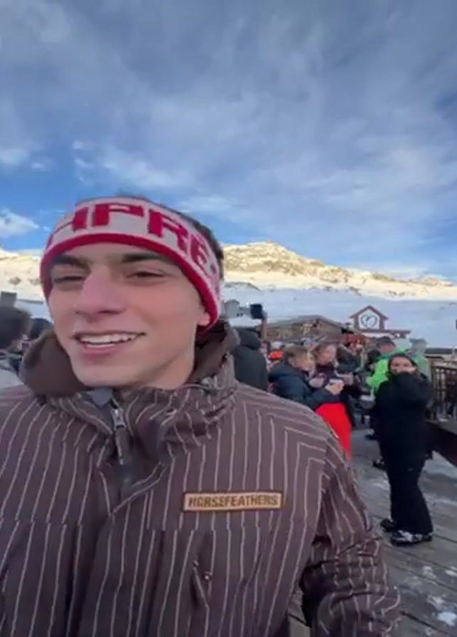 The video captures a lively après-ski scene in a mountainous area. Several people are visible, most holding drinks, suggesting a social gathering. The main subject, a young man wearing a striped jacket and a red and white headband, is holding a glass of beer. The backdrop showcases a snowy mountain range under a partially cloudy sky. The scene appears to be on a wooden deck or platform, with a building visible in the background, suggesting a ski resort or lodge. People are mingling and appear to be enjoying the atmosphere with music playing. The overall impression is that of a festive, outdoor celebration in a winter setting.