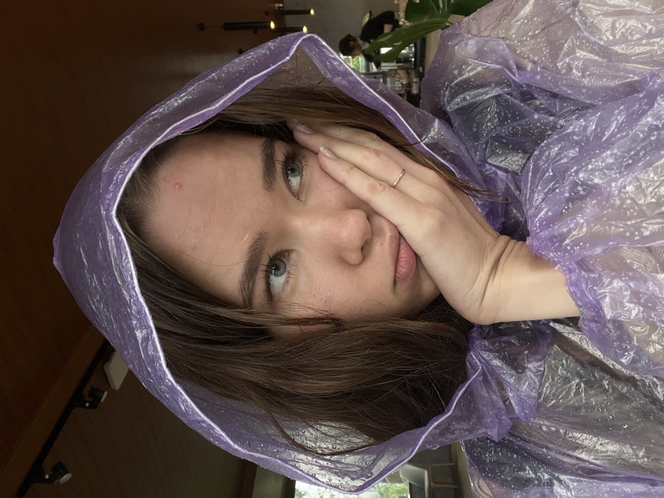 A woman wearing a lavender plastic poncho looks up and to the left. She has brown hair and light eyes. Her hand is partially obscuring her face. The background is blurry, but seems to be an indoor setting with other people visible. The photo has a slightly rotated perspective.