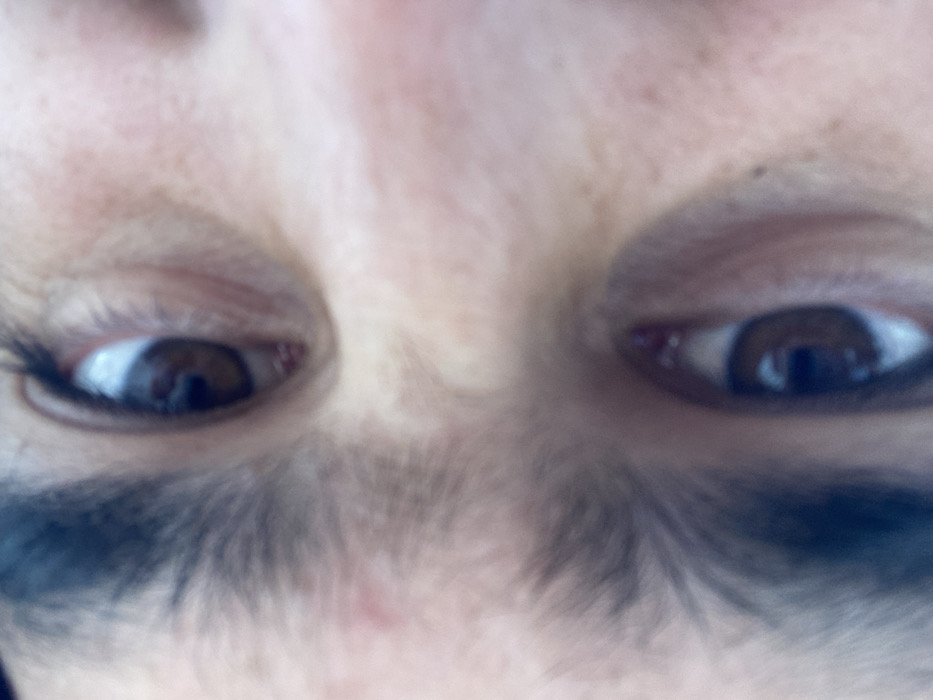 A close-up shot focuses on a pair of eyes. The eyes are brown, and a white reflection can be seen in the pupils. Dark smudges are under the eyes, possibly makeup. Skin tone is light, with visible pores. The image's focus is soft, giving it a slightly blurred appearance. The person's gaze is downwards, not directly at the camera.