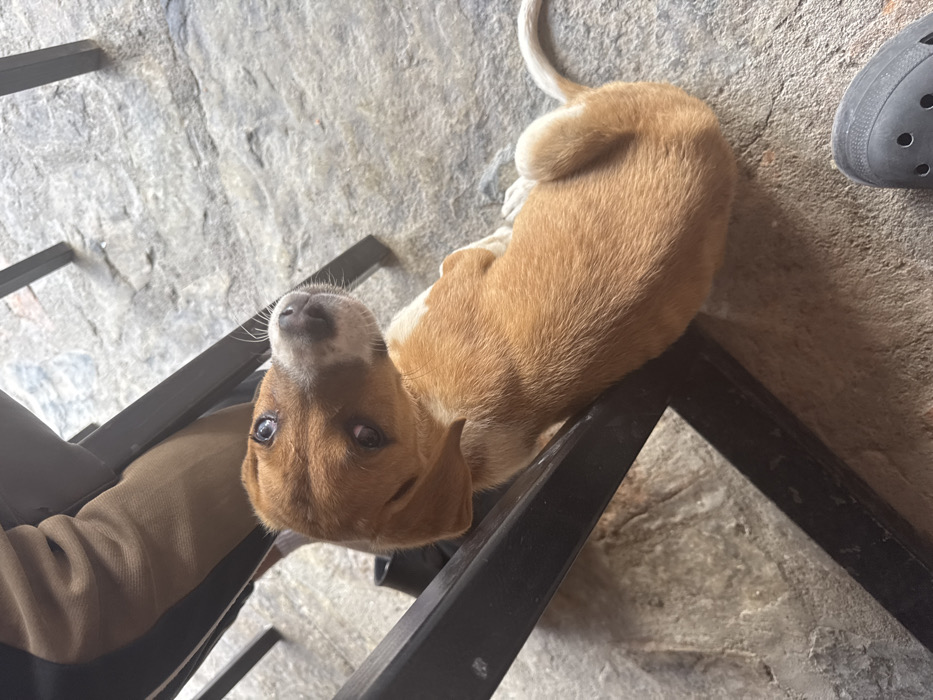 - "The image depicts a light brown and white puppy resting on a textured, light gray concrete or stone surface in Kvakhvreli, Georgia" by FM-EU4xB3, licensed under CC BY 4.0