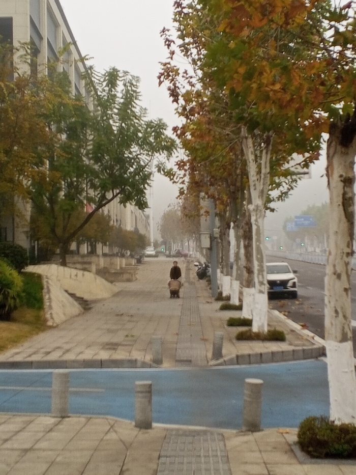 A person pushes a cart along a grey paved sidewalk lined with trees showing fall colors. The trees have been whitewashed at their bases. A blue painted road divider runs parallel to the sidewalk. A building is visible on the left side of the sidewalk. Cars and motorcycles are parked along the street to the right. The weather appears hazy or foggy, reducing visibility in the distance. The overall impression is of an urban street scene on a muted day.