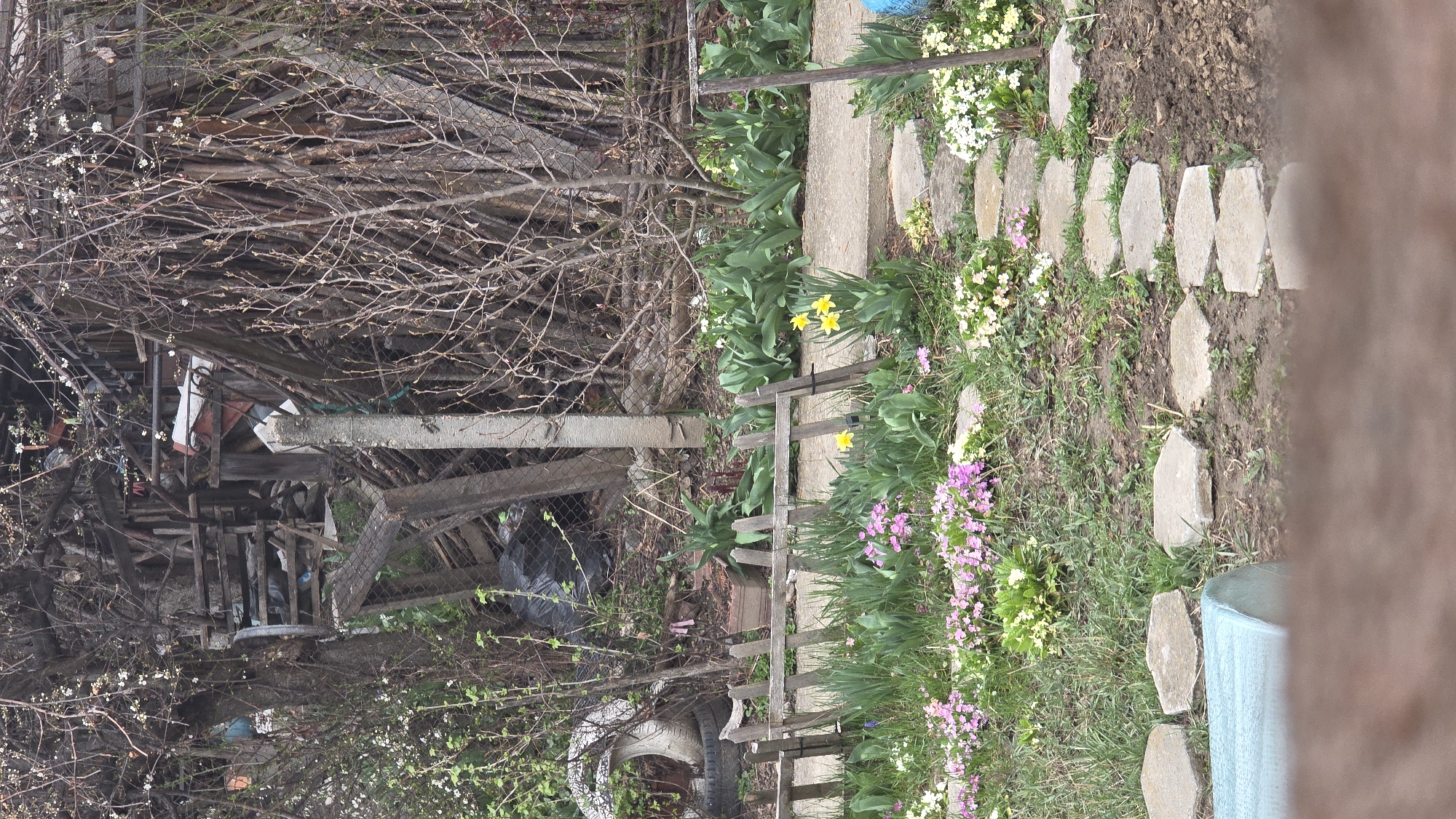 The image depicts a cluttered backyard or garden scene. A wooden fence separates a pathway of irregularly shaped stones from an area filled with discarded materials and construction debris. Vegetation is visible, including flowering plants, grass, and daffodils. A wire fence, concrete posts, and piles of wood and debris are present in the background.