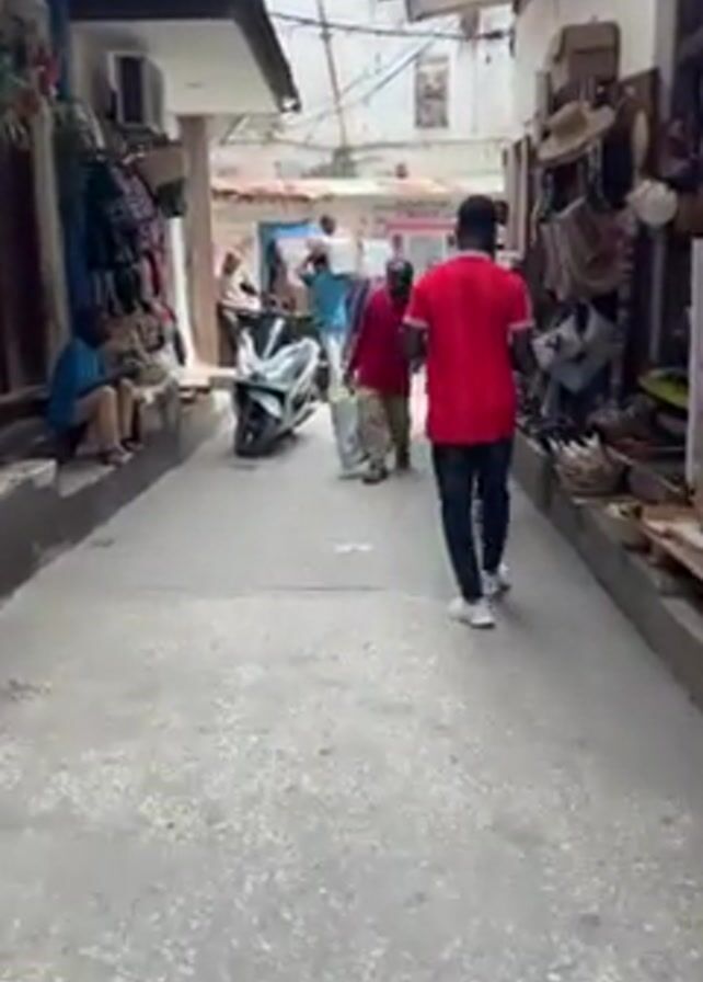 A narrow alleyway is shown from a low-angle perspective, with several people walking in the same direction away from the camera. The alley is paved with grey textured tiles. A man in a red shirt and dark jeans walks in the foreground. To the left, a man sits on a raised ledge near goods for sale. Further ahead, a parked white scooter is visible. A woman in a colorful patterned dress and headscarf walks directly towards the camera carrying a red shopping bag. Other people walk in the background, some carrying packages. The alley is lined with buildings on both sides, with a variety of shops and goods displayed. Air conditioning units are visible on some buildings. The sky is visible at the end of the alleyway.
