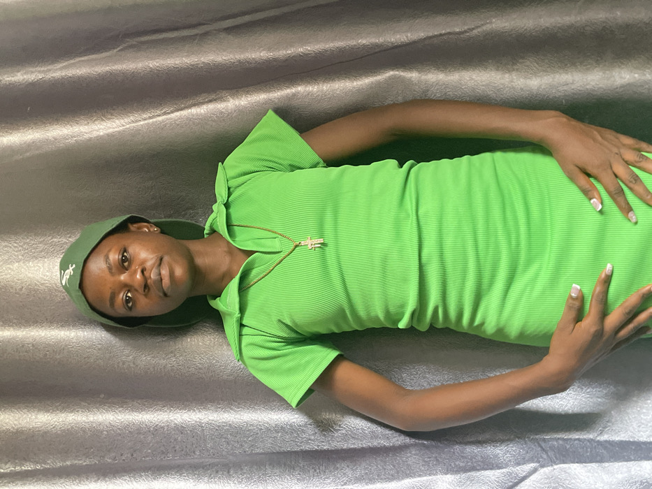 A female individual is depicted in a full-body portrait against a draped grey curtain backdrop. She has a dark complexion and is looking directly at the camera with a neutral expression. She wears a vibrant green, ribbed, short-sleeved dress with a collar and a V-neck opening. A dark green baseball cap, featuring a white "SoX" logo, is positioned on her head. Around her neck is a thin, gold-colored chain necklace with a small, cross-shaped pendant. Her arms are bent at the elbows, and her hands are clasped in front of her midsection, resting on the dress. Her fingernails are manicured with white tips. The environment is an undetermined indoor location in Badagry, Nigeria.