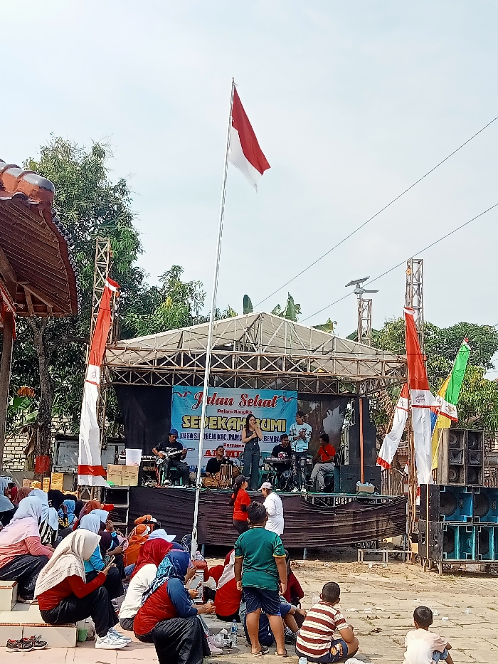 An outdoor event is depicted in Sidorejo Village, Pamotan District, Rembang Regency, Indonesia, under a bright, hazy sky