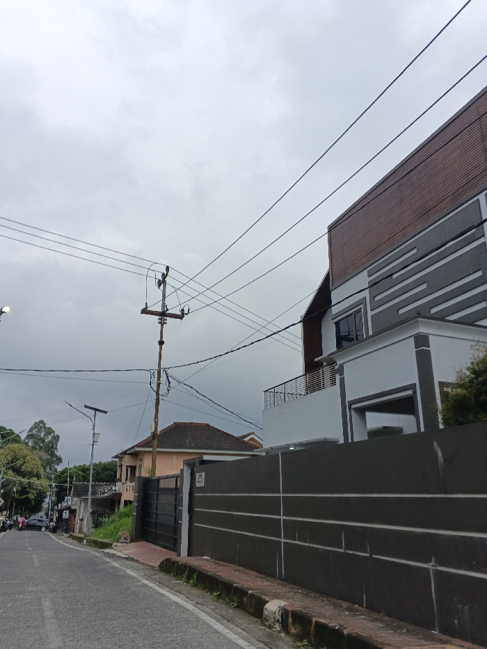 This image depicts a street scene in Bhimad, Nepal, under a heavily overcast grey sky. The asphalt road curves slightly to the left from the lower foreground, bordered on the right by a concrete curb with minimal vegetation. Along the right side, a dark grey perimeter wall, approximately 1.5 meters high, features four horizontal white lines and a dark metal gate with a white 'M' logo. Behind this wall, a modern, two-story building with a multi-textured facade is visible. Its lower portion is light grey with dark grey geometric accents, featuring dark-framed windows and a second-story balcony with a white railing. The upper story is clad in brown wooden paneling. In the mid-ground, a tall wooden utility pole with multiple crossarms supports numerous black electrical or communication lines that crisscross the frame. To its left, further down the street, a streetlight with a solar panel is present. Behind the gate and utility pole, a single-story, peach-colored house with a dark reddish-brown tiled roof is partially visible. In the background on the left, green trees and less distinct structures line the roadside. Several blurry figures and what appear to be parked or moving motorcycles are visible in the distance on the left side of the road. No specific actions or interactions are clearly discernible.