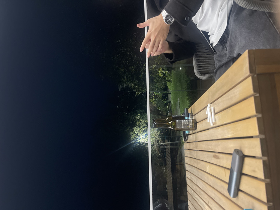 The scene depicts a nighttime outdoor setting on a terrace or balcony in Matosinhos, Portugal. A person is partially visible on the right, seated at a light wooden slatted table. The individual wears a black jacket over a white t-shirt, dark jeans, and a silver-colored wristwatch with a black face on the left wrist. Their hands are clasped with interlocked fingers. On the table, from left to right, are a dark gray electronic heated tobacco device, five white cylindrical tobacco sticks, and two dark glass beer bottles, appearing empty or near-empty. A small blue object is partially visible behind the bottles. A clear glass barrier with a white top rail separates the terrace from a dark, tree-filled outdoor area. A bright artificial light source illuminates a section of the trees in the mid-ground, and the sky above is dark.
