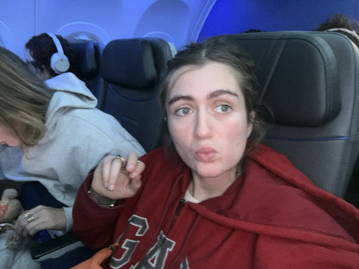 A person wearing a red hooded GAP sweatshirt makes a kissing face towards the camera. Another person wearing a grey hoodie and white headphones sits beside them. They are seated on an airplane, judging by the seats and the window in the background. The lighting inside the plane is blue.