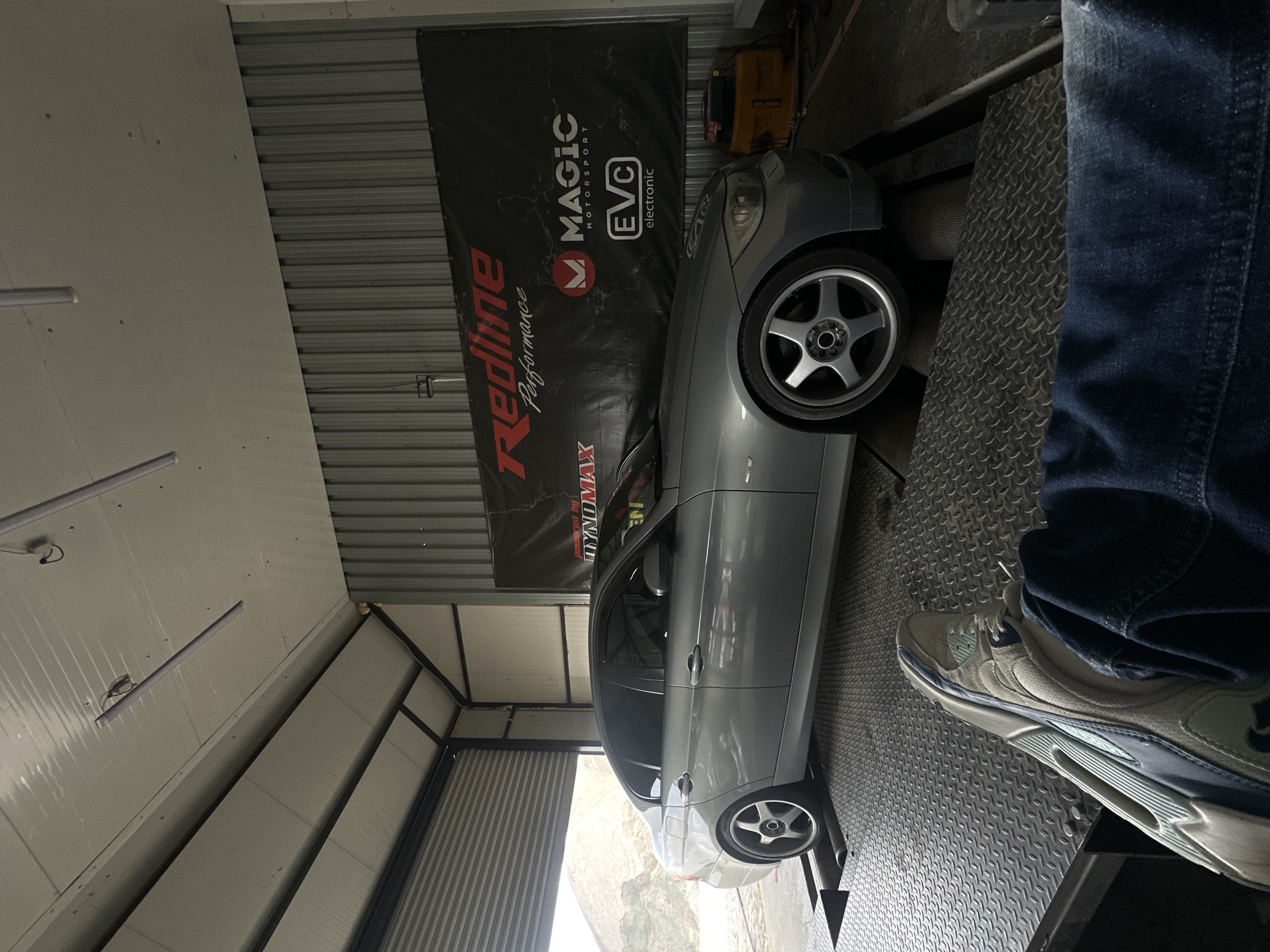The image depicts the interior of what appears to be an automotive garage. A silver car, possibly a sedan, is positioned on a dynamometer platform. A large banner with "Redline Performance" and "Magic Motorsport" logos is visible on the wall behind the car. A person wearing jeans and sneakers is standing near the vehicle. The garage has metal walls and ceiling. It cannot be determined from the image if the location is in the city of Negovan, Bulgaria.