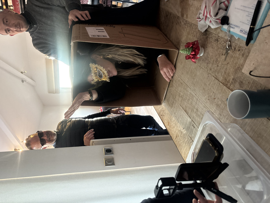 The scene depicts an indoor room, identified as being in Marseille, France, where three adults are engaged around a wooden table. A blonde woman, wearing a gold and white Venetian-style masquerade mask and a black long-sleeved top, is positioned inside a brown cardboard box resting on the table. Her right hand is raised with an open palm; she is smiling. A balding man in a grey long-sleeved top stands behind her, his hands resting on the top edges of the cardboard box. To the left, a bearded man wearing black sunglasses and a black quilted jacket smiles while partially visible behind a white doorframe, observing the woman. In the foreground on the wooden table, a black smartphone on a small tripod and a black GoPro camera are positioned on a clear plastic container, both pointed towards the individuals. Other items on the table include a small green, red, and white Christmas tree ornament, a teal mug, a set of keys, a pen, a crumpled white and red striped cloth, and a document on a blue clipboard. The background features a white wall with light switches, and a window with white blinds allowing bright natural light into the room. The overall environment suggests a casual, possibly recorded, playful activity.