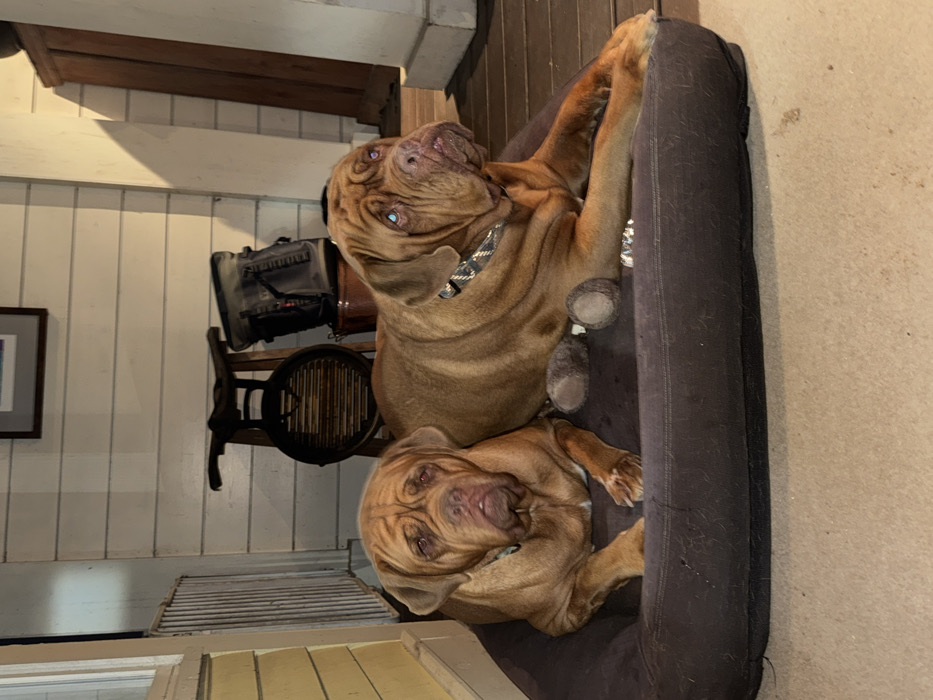 - "Two Dogue de Bordeaux dogs rest on a dark brown dog bed" by FM-IdNfF2, licensed under CC BY 4.0