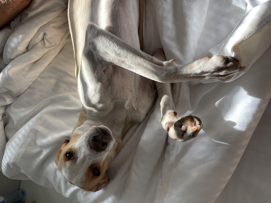 A tan and white canine is observed lying on its left side on white, horizontally striped bedding within an indoor setting. The dog's head is tilted, presenting a direct gaze towards the viewer. Tan fur marks the dog's ears, around its dark eyes, and across its muzzle, contrasting with its predominantly white underbelly and limbs. Distinct shadows from an external light source (likely sunlight) fall across the dog's body and the rumpled sheets. The dog's front paws are visible, displaying light-colored nails. Small, reddish-brown dermal spots are present on the fur of its right front leg. In the upper left background, a blue water bottle is partially visible on a white surface. A human limb, consistent with a leg or arm, is partially obscured by the white bedding in the upper right background. This scene is located in Petrovac centar, Montenegro.