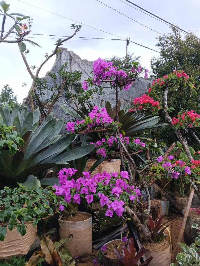 The image displays a vibrant, densely planted garden scene in Lvea Aem District, Cambodia, under an overcast sky. The foreground and mid-ground are dominated by numerous flowering bougainvillea plants, presenting abundant clusters of bright magenta and red blossoms. Many of these plants are trained on exposed, gnarled wooden branches or black metal ring supports, while others grow from cylindrical pots constructed from light brown woven fabric, resembling burlap sacks. Large, broad-leafed tropical plants with prominent blue-green foliage are centrally located in the mid-ground. Smaller green shrubs and various potted plants, including some with reddish-brown leaves, are positioned at ground level. In the background, a tall, gray, textured structure resembling a jagged rock formation or artificial wall rises significantly. Multiple dark utility lines are visible crossing the cloudy sky overhead. No individuals are present within the frame.