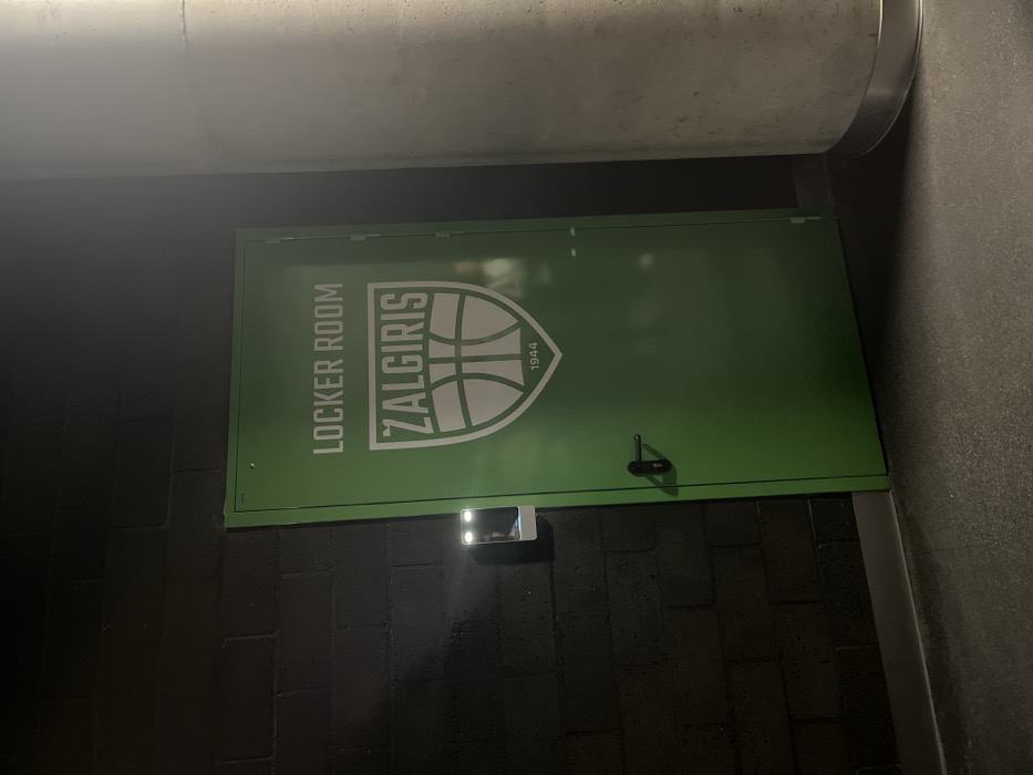 The image depicts an indoor scene focused on a vertical, dark green metal door. Centered at the top of the door is the white text "LOCKER ROOM." Below this, a large white shield-shaped logo features "ZALGIRIS" prominently at the top, a basketball graphic in the center, and the year "1944" at the bottom. A black lever-style door handle is visible on the left side of the door, positioned approximately two-thirds of the way down. To the immediate left of the door is a dark, black-painted brick wall. Mounted on this wall, approximately at the height of the door handle, is a rectangular, light-colored device with two horizontally aligned, illuminated light sources at its top. A faint, indistinct reflection is discernible on the device's surface. To the right of the door, a large, cylindrical, light gray concrete pillar, equipped with a metallic band near its base, is partially visible. The floor is a uniform, dark gray surface. The scene is generally dimly lit, with the wall-mounted device providing a distinct localized light source. Based on the Žalgiris logo, the location is inferred to be in Kaunas, Lithuania, likely within a facility associated with BC Žalgiris.