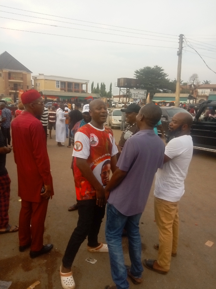 A group of men are gathered in an outdoor setting, seemingly in a public area. One man stands out, wearing a red and white shirt featuring a portrait of a person, possibly a political figure. Adjacent to him, another man is dressed in a purple shirt and jeans, while a third man sports a white shirt and khaki pants. The setting appears to be a busy street with people milling about in the background. Buildings and cars are also visible, contributing to the scene's overall crowdedness.