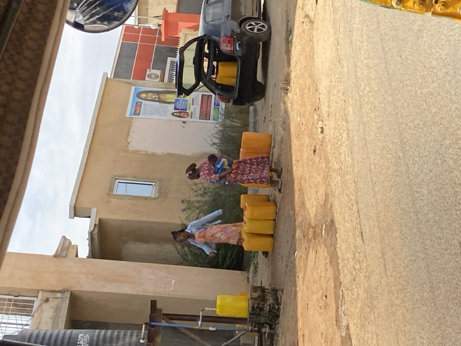 This image depicts a street scene in Jos, Nigeria, showing activities related to water collection. **Environment:** The foreground features an asphalt road surface, partially obscured by the vehicle from which the photograph was taken. Immediately adjacent to the road is an unpaved, dusty reddish-brown dirt shoulder. In the background, several light brown or beige buildings are visible, some appearing residential or commercial, with varying states of finish. A building on the left has a large black cylindrical water tank mounted on a stand. Another building further right features a large vertical poster on its facade, displaying images of women. The sky is partly cloudy. **Objects:** Numerous bright yellow plastic jerrycans are central to the scene. Approximately nine are stacked on the ground in the mid-ground, and at least three more are visible inside the open trunk of a black hatchback car parked on the right. One yellow jerrycan sits on a low concrete block beneath a water tap connected to the black water tank on the left, with water dripping. The black hatchback is parked facing right, with its rear passenger side tire and a portion of its right side mirror visible. **People and Actions:** Two adult females are present. On the left, a younger woman wearing a light blue denim jacket over a floral or patterned dress stands near the stacked yellow jerrycans. She appears to be looking towards the right or slightly beyond the frame. To her right, a second woman, dressed in a patterned red and white long dress, carries an infant securely on her back in a blue fabric carrier. She stands near the group of jerrycans on the ground, facing generally towards the left. There is no direct interaction evident between the two women. The overall scene suggests the process of fetching and transporting water.