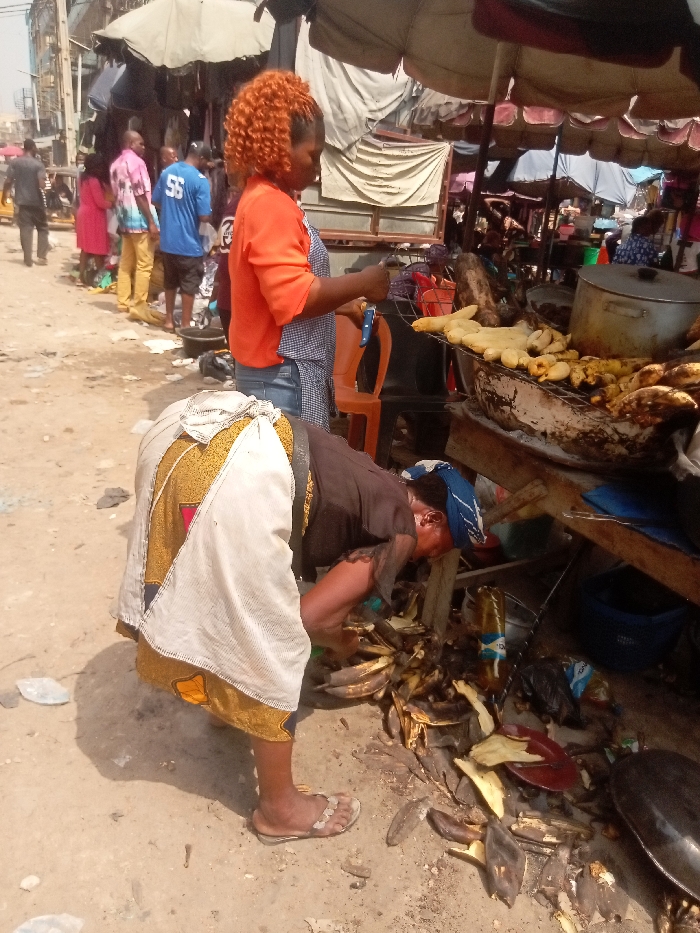 This image captures a bustling street food market scene in Onitsha, Nigeria. In the foreground, two women are present. On the right, a woman with vibrant orange curly hair, wearing an orange top, blue denim apron, and blue jeans, stands behind a makeshift cooking station. She holds a blue-handled utensil, appearing to manipulate items on a metal grill over an open fire. On the grill, various food items, including whole plantains, sliced yams, and what appear to be chicken pieces, are being cooked. A large metal pot sits to the right of the grill. To the left and slightly in front of the standing woman, another woman is deeply bent over, facing right. She wears a dark brown shirt, a patterned yellow and white wrapper skirt, and a blue headscarf. Her back is to the viewer, and she appears to be sorting through or collecting items from a substantial pile of discarded plantain peels and other organic waste on the dirt ground beneath the cooking station. She wears light-colored flip-flops. The immediate ground is unpaved dirt, scattered with debris, including more plantain peels and plastic waste. In the middle ground, several people are visible. A man in a blue "56" sports jersey stands near another man in a pink patterned shirt and beige trousers. Further back, more figures are discernible, some walking, within a dense market environment characterized by numerous stalls, fabric awnings, and umbrellas providing shade. Structures resembling multi-story buildings are visible in the far background, completing the urban market setting.