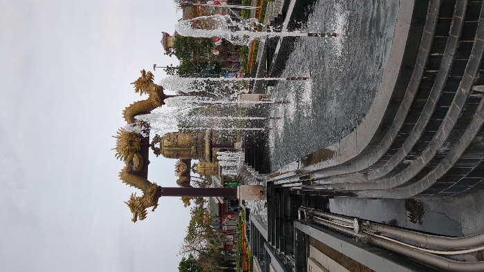 The scene is an outdoor public area located in Bai Chay Ward, Vietnam, presented under an overcast sky. A multi-tiered water fountain system occupies the foreground and midground, characterized by dark-tiled steps descending into basins where multiple vertical water jets are actively spraying. Adjacent to the main fountain on the left, a narrower water channel contains visible piping. Prominently situated in the midground is a decorative archway, supported by dark pillars, featuring two large, golden dragon sculptures positioned symmetrically with heads facing inward. Beneath this archway, at least two large, ornate golden bells are suspended. In the background, several buildings displaying traditional Vietnamese architectural features are visible, along with scattered trees and landscaped green areas. A few human figures are present in the distant background near the structures, but their specific actions or identities are not discernible.