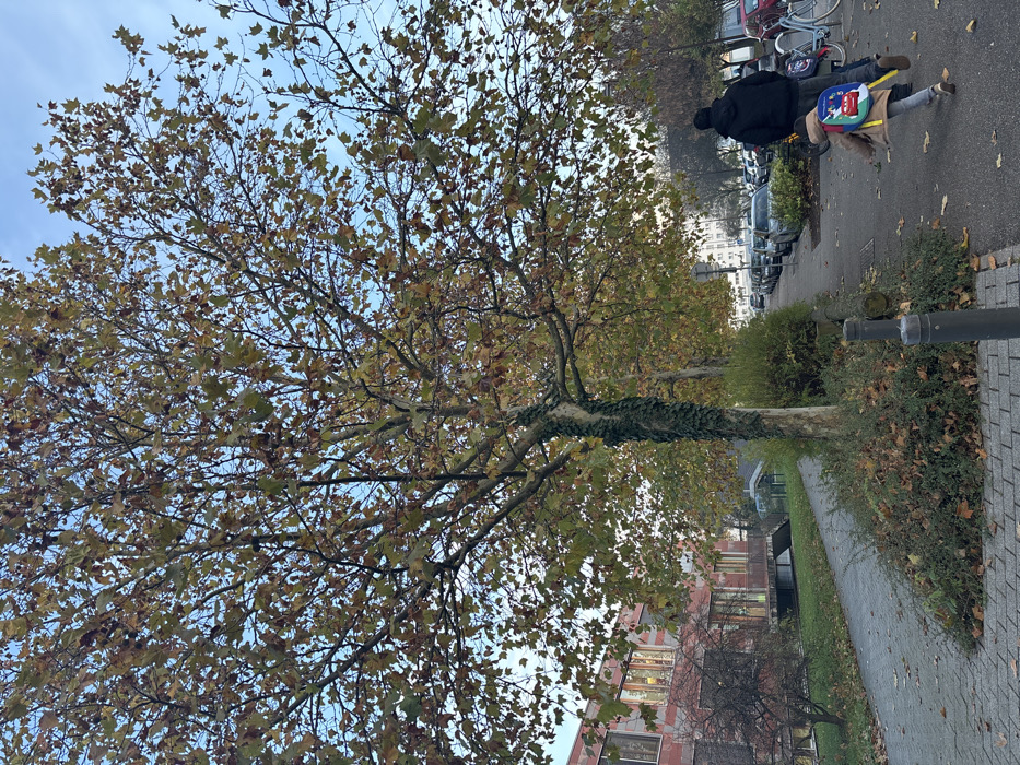 The image presents an urban street scene in Strasbourg, France, during daytime under a partly cloudy blue sky, indicative of autumn. A large deciduous tree, likely a plane tree, with mottled bark and leaves in shades of green, yellow, and brown, occupies the central foreground, its trunk partially covered with dark green ivy. To the left of this tree, a paved pedestrian path separates it from a multi-story building featuring reddish-brown and lighter-toned paneling, multiple windows, and balconies. This building is set back behind a grassy slope with some bare shrubs and scattered fallen leaves. To the right of the central tree, a gray paved sidewalk runs parallel to a street with numerous parked vehicles, primarily cars, lining the curb. Several bicycles are also visible parked further down the street. Two individuals are observed on this right-hand sidewalk, walking away from the camera. An adult, clad in a dark hooded jacket and dark trousers, follows a smaller child. The child wears a light-colored jacket, dark trousers, and a multicolored backpack featuring animated characters, and appears to be walking or running ahead of the adult. A dark grey cylindrical street bollard is visible in the lower right foreground.