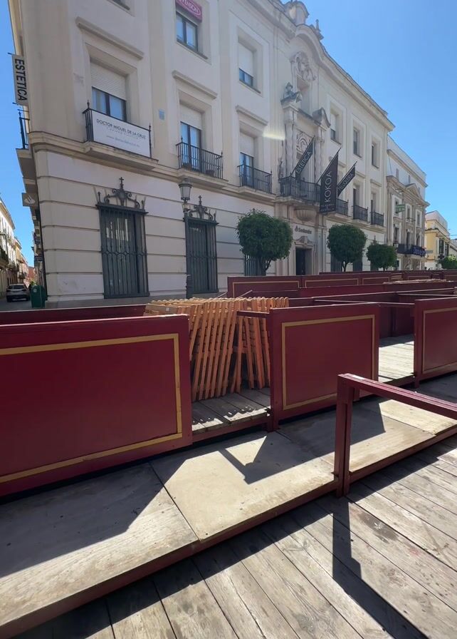 The camera moves slowly down a cobbled street lined with dark red barriers. The barriers extend down the length of the street. People walk in the middle of the street behind the barrier. Buildings line both sides of the street. The buildings are all white with dark windows and balconies. There are trees interspersed in front of the buildings on the right side of the street. The sky is a clear blue with the sun shining brightly.