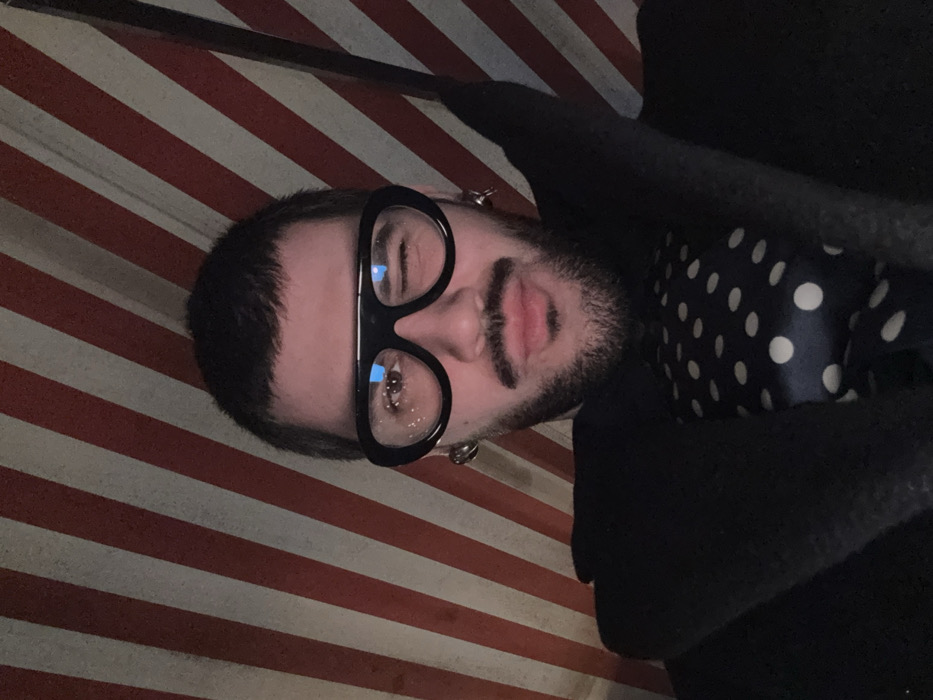 A man with a beard and large, round, black glasses stands in front of a red and white striped background. The man is wearing a black coat with a dark blue, polka-dotted shirt visible underneath. He is tilting his head slightly, giving the image an angled perspective. His lips are pursed, and he appears to be looking directly at the camera. The image is somewhat dark, with the lighting focused on the man's face.