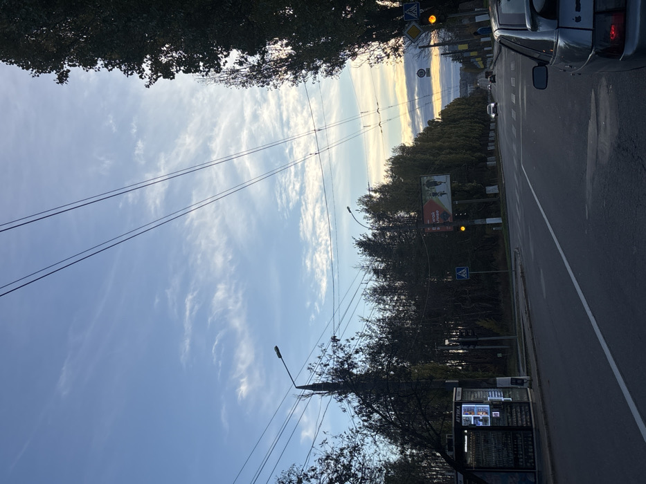The image captures a late afternoon or early evening street scene on Prospekt Liudvyka Svobody in the Oleksiyivka district of Kharkiv, Ukraine. The vantage point is from the right lane of a multi-lane asphalt road, with the rear of a light grey sedan, featuring a spoiler, partially visible in the lower right foreground. Overhead, numerous utility and trolleybus wires extend across a sky that gradients from deep blue at the zenith to lighter blues and warm orange-yellow hues near the horizon, dotted with wispy, elongated clouds. On the left side of the road, a dark-colored kiosk labeled "АПТЕКА" (Pharmacy) and "АТЛАС" is visible, displaying various products behind glass panels. Adjacent to the kiosk, a tall street light pole with a modern fixture rises. Behind these structures, a dense line of dark-foliage trees forms a visual barrier, suggesting a green space or forest edge. The asphalt road features a solid white line on the right and a dashed white line for lane separation, with several lighter patches indicating repairs. On the right side of the road, a continuous row of tall, slender trees with dark green leaves lines the street, receding into the distance. Above these trees, a large billboard displays an advertisement featuring two people on bicycles, with partial text visible (likely "Захисти себе від грипу," meaning "Protect yourself from flu"). Near the billboard, a yellow pedestrian traffic light and a blue square pedestrian crossing sign are visible. Further down the road, a red and white circular "no parking" sign is present. Several vehicles are observed driving away in the far distance.