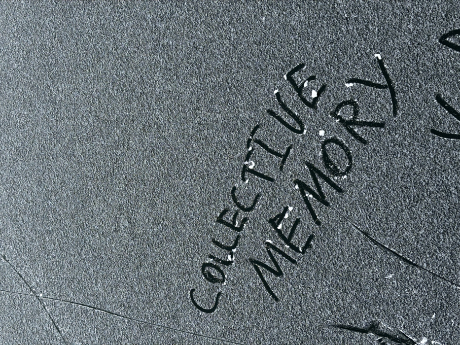 The image displays a dark gray, granular, textured surface, consistent with concrete or asphalt, located in Tsovazard, Armenia. Faint, irregular linear cracks are visible on this surface. The phrase "COLLECTIVE MEMORY" is handwritten in black, oriented diagonally from the lower-left to the upper-right of the frame. The letters are somewhat unevenly formed, and small white particulate matter adheres to their edges and within their forms, suggesting a chalk-like substance or similar residue on a coarse substrate. No individuals, actions, or interactions are present. The scene is illuminated by diffuse, even lighting.