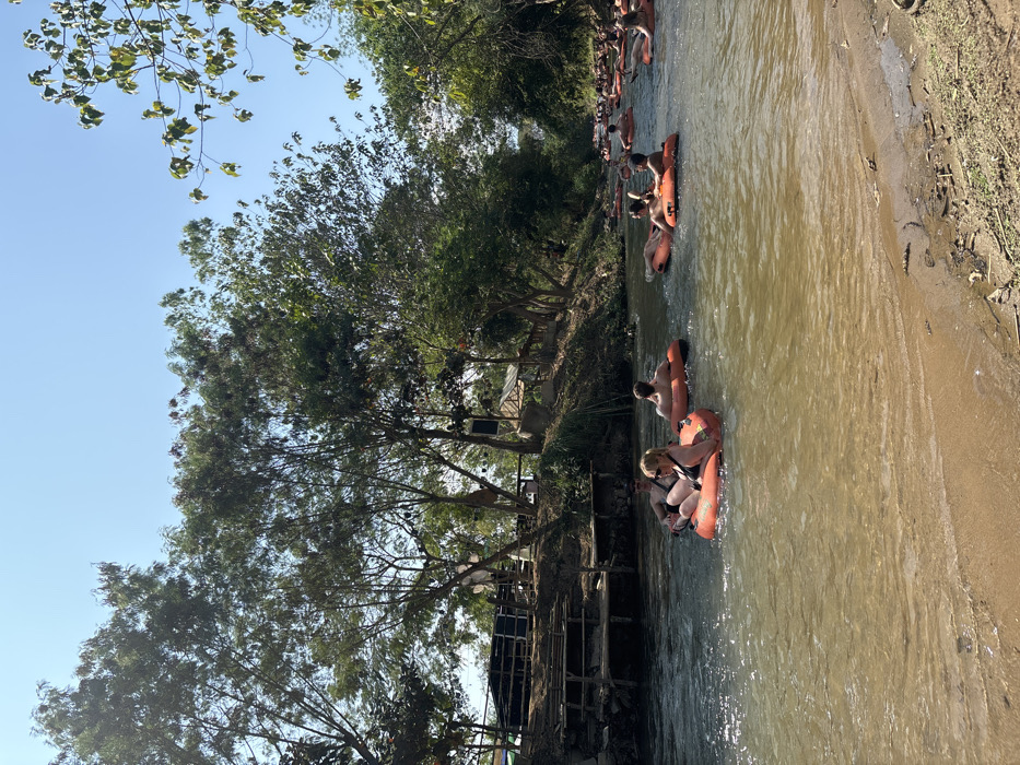 People float down a river on orange inner tubes. Trees line the left bank with various structures nestled amongst them. The right bank has a muddy edge. The sky is blue.