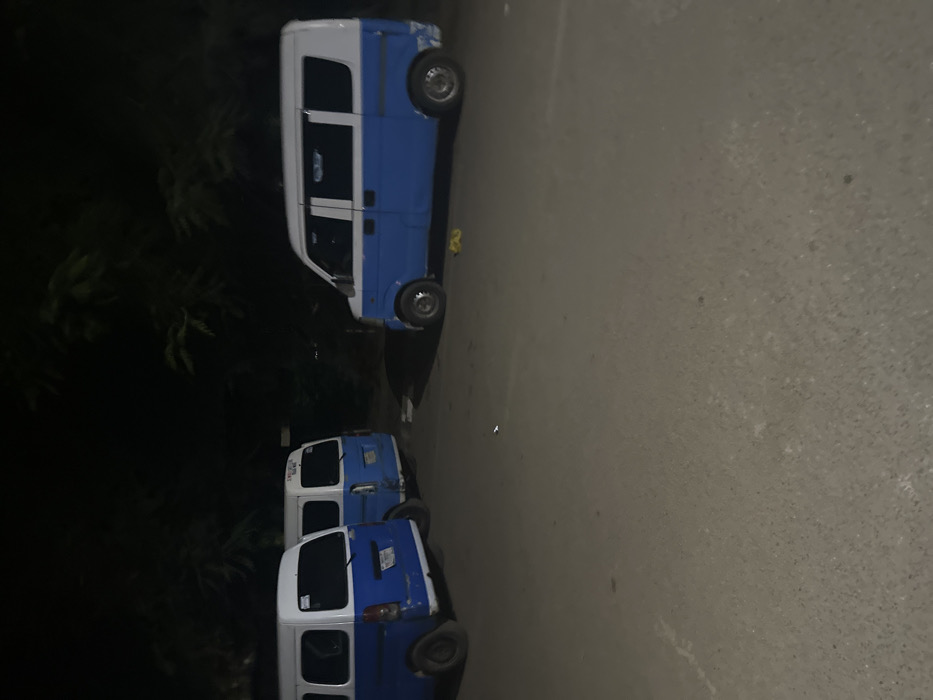 Three white and blue vans are parked on an asphalt road. The background is dark with trees visible on the left. The vans are compact and appear to be identical models. The lighting is dim, creating shadows and making it difficult to discern details. The image is oriented vertically.