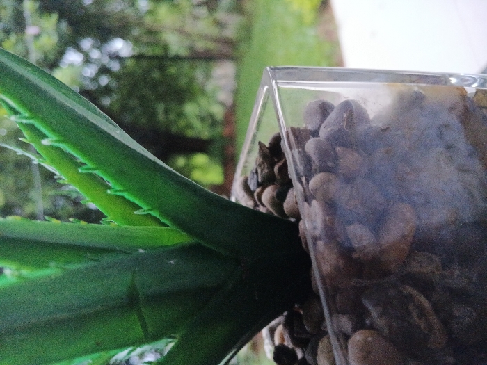 - "A close-up shot features a vibrant green aloe vera plant juxtaposed against a clear, square vase filled with small brown stones" by FM-X3Isl2, licensed under CC BY 4.0