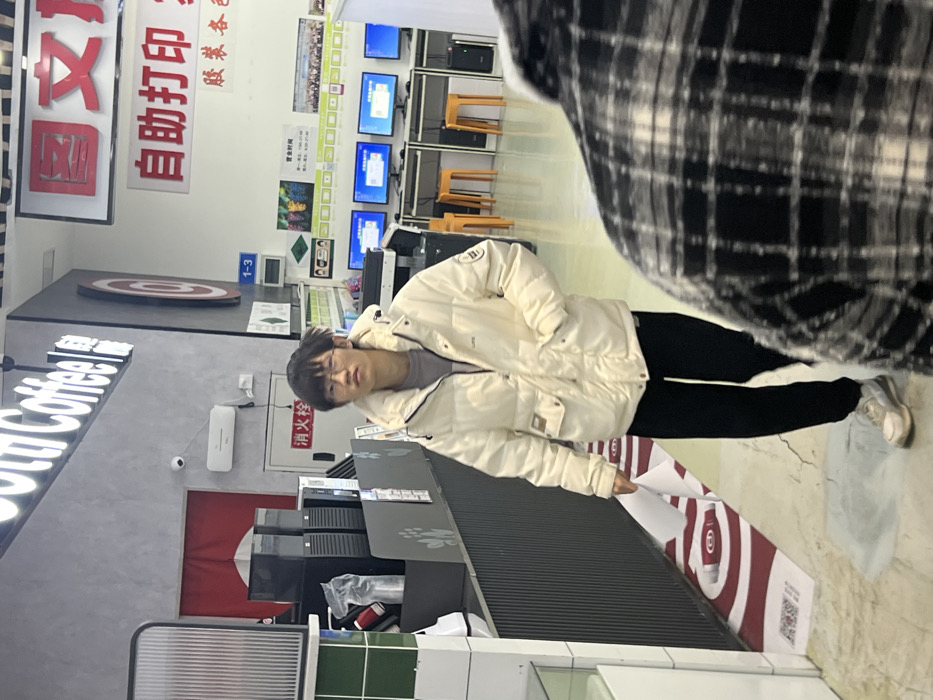 A person in a white puffer jacket and black pants stands indoors. Behind them, rows of computers and monitors are visible, along with signage in Chinese. A large plaid shirt partially obscures the view. A red and white target is on the floor. Another sign reads "South Coffee." The setting appears to be a public printing or internet access area.