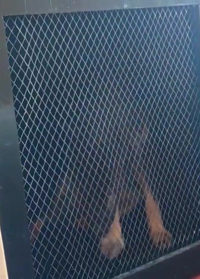 small, brown, furry animal in a cage made of wire mesh within a black frame. The animal is moving around, clinging to the mesh, and making a squeaking noise. The cage appears to be indoors, and the lighting is somewhat dim.