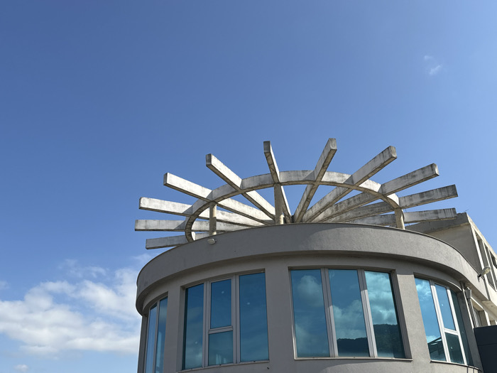 The image displays the upper portion of a building in Razhdak, Bulgaria, set against a clear blue sky with sparse white cumulus clouds. The building exhibits a light gray, textured, curved facade on its upper level, featuring multiple large, rectangular windows with a reflective blue tint that mirror the sky and distant topographical features. Crowning this curved section is a distinctive architectural element: a radial arrangement of light gray concrete beams forming a sunburst pattern. A rectilinear extension of the building, also in light gray, is visible on the far right. No individuals, specific actions, or interactions are present within the scene.