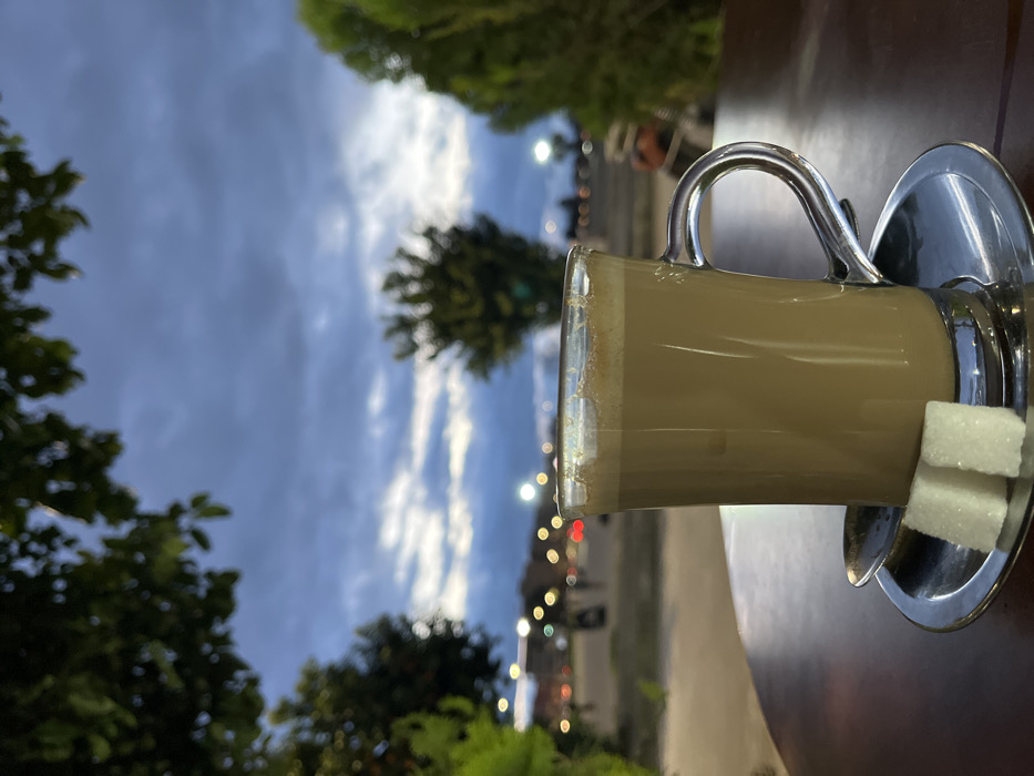 A glass mug, filled with a tan-colored beverage and topped with foam, sits on a silver saucer with two sugar cubes. The scene is set outdoors, with a dark wooden table visible beneath the drink. In the background, the sky is a mix of dark clouds and patches of light, suggesting twilight. Trees and streetlights line the background, creating a soft bokeh effect.