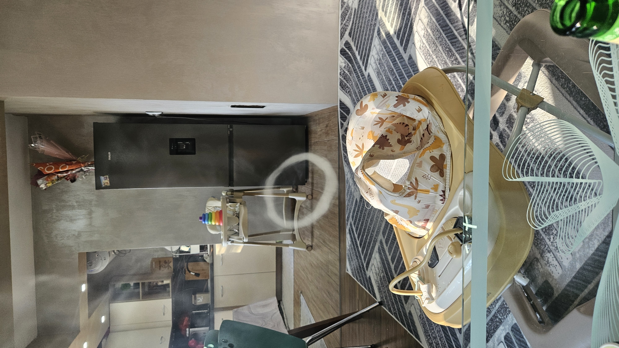 The image depicts the interior of a home. In the foreground, a baby walker is situated on a patterned rug. Behind it, there is a high chair. A refrigerator stands against a wall. The scene extends into a kitchen with cabinets and other household items. The location is unspecified.