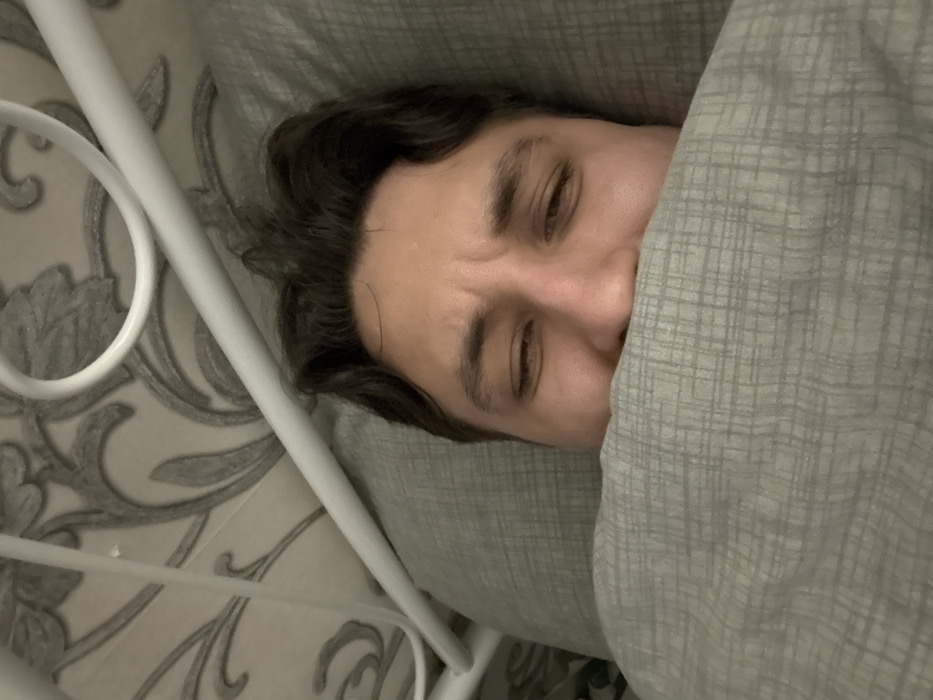 A man lies in bed, mostly covered by a gray blanket. Only his head is visible, with dark hair slightly mussed and facial features suggesting a mix of drowsiness and discomfort. His eyes are partially closed, hinting at an attempt to sleep or shield himself from light. A white, decorative metal bed frame is on the left. A patterned surface, possibly wallpaper, is behind the bedframe. The overall tone suggests a feeling of coziness mixed with unease.
