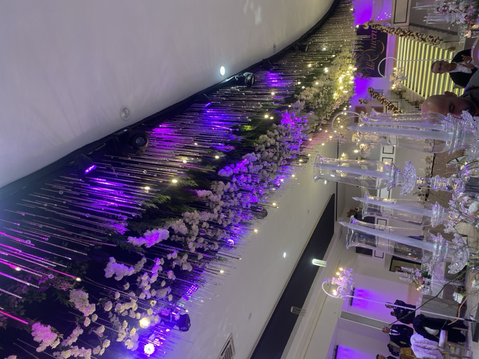 A decorated ceiling features hanging crystals, white flowers, and greenery illuminated by purple lights