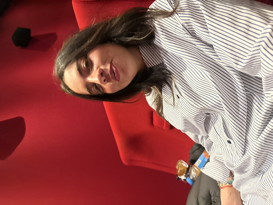 A single female subject is observed seated in a modern cinema auditorium, likely located in Paris, France, consistent with the design of venues such as Pathé Parnasse. The interior features plush, individual red seats and red acoustic wall paneling. The subject, an adult with long, dark hair, is wearing a white collared shirt with thin dark blue vertical stripes and multiple beaded bracelets on her left wrist. She is looking directly at the camera with a neutral to subtly smiling expression. To her immediate left, an adjacent seat or armrest holds a dark jacket, an open bag of snacks (orange-colored packaging), and a partially visible plastic bottle containing a light-colored liquid. A black, possibly square-shaped, object is mounted on the red wall in the upper right quadrant of the image.