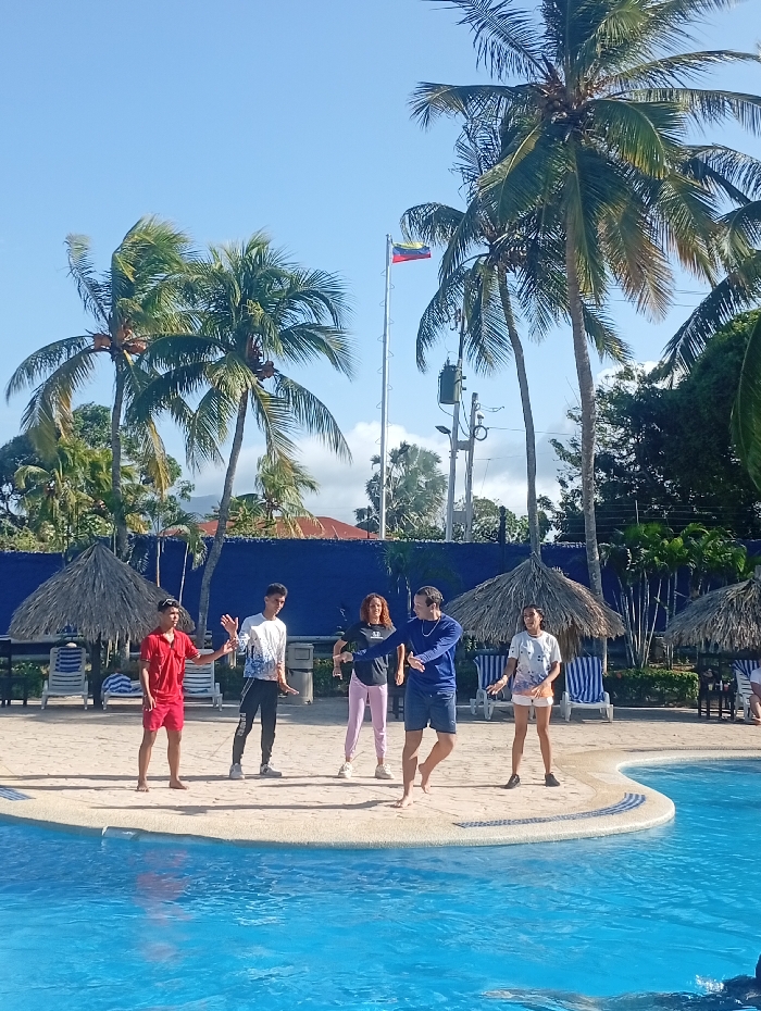 Five people are on a small, circular, concrete island in a pool. Four are standing, and one is in mid-air, as if dancing or jumping. Palm trees surround the pool area. In the background, a flag flutters on a pole under a partly cloudy, blue sky. A blue fence and buildings are also visible further back. Poolside lounge chairs and tiki umbrellas sit around the pool.