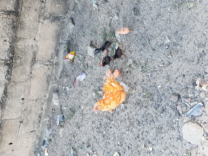 - "In Lokoja, Nigeria, an adult golden-orange hen and approximately seven chicks are present on a dry, uneven gray-brown dirt surface" by FM-e11JB3, licensed under CC BY 4.0