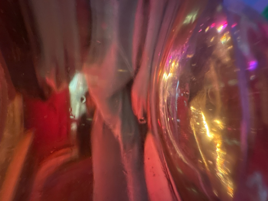The image depicts a highly distorted and abstract view, originating from within a translucent, curved container such as a glass or bottle, located in Paris, France. The upper portion of the frame exhibits deep red and reddish-pink hues, containing blurred, undefined shapes indicative of an interior or distant environment. A faint, highly distorted human face, appearing as a profile, is visible in the upper right quadrant, oriented towards the left. The lower half of the image is characterized by intense, blurred reflections of multiple artificial light sources, predominantly golden, yellow, pink, and purple. These reflections manifest as luminous streaks and pools on the curved surface, signifying an urban night setting. The composite elements suggest the container is situated in an environment where both interior elements and exterior city lights are present and refracting through its medium.