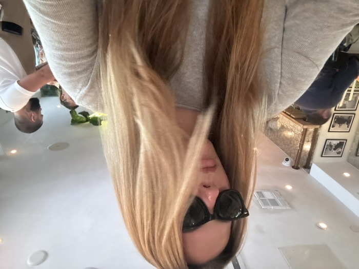 A female with long blonde hair and black sunglasses is centrally positioned in a close-up interior shot of a restaurant or cafe in Miami Beach, United States