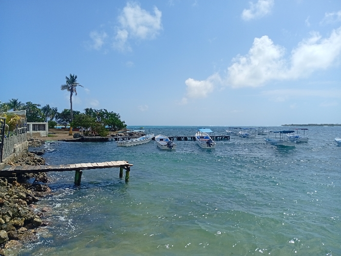 A sunny day scene shows a calm bay with several boats anchored. A wooden pier extends from a rocky shoreline into the clear turquoise water. The shoreline features a mix of vegetation, including a palm tree. In the distance, a thin strip of land marks the horizon. The sky is a bright blue with scattered white clouds.