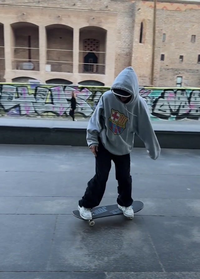 young person skateboarding in an urban setting, landing a trick. The person is wearing a grey hoodie with a logo, black pants, and white sneakers. They are skateboarding on a paved area with graffiti-covered walls in the background. Several other individuals are standing around observing. One man wearing a black hoodie and a black baseball cap is standing with his arms crossed, watching. There are buildings and sculptures visible in the background.