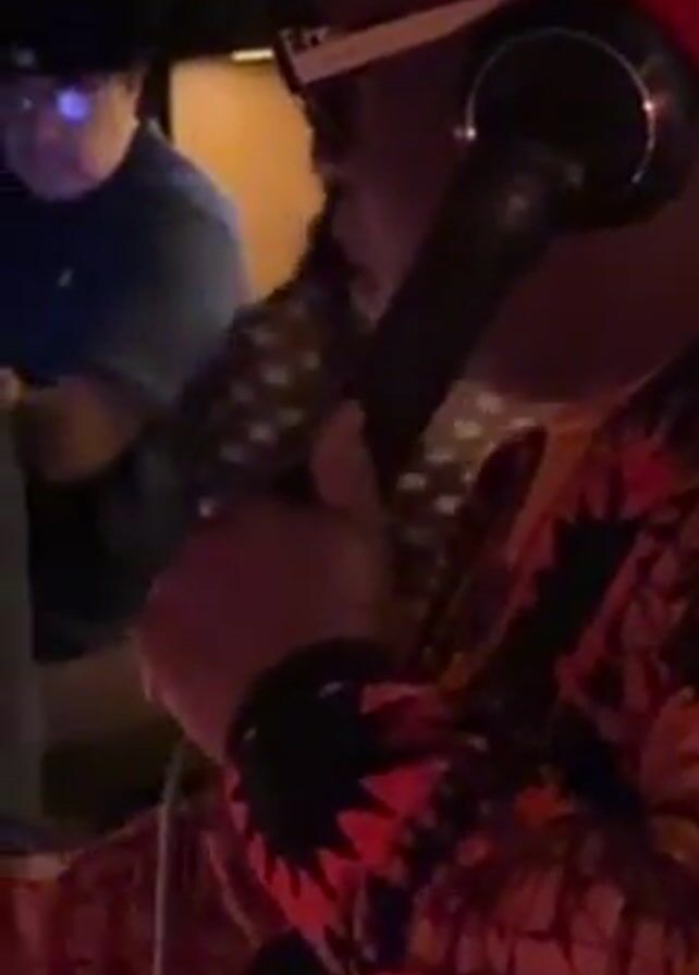 person in a brightly patterned shirt, wearing a red hat and glasses, holding a microphone in front of a turntable. The turntable is lit with red and blue lights. A record is spinning on the turntable, and the person's hand is on the record. There are other people in the background, but they are out of focus. The room is dark.