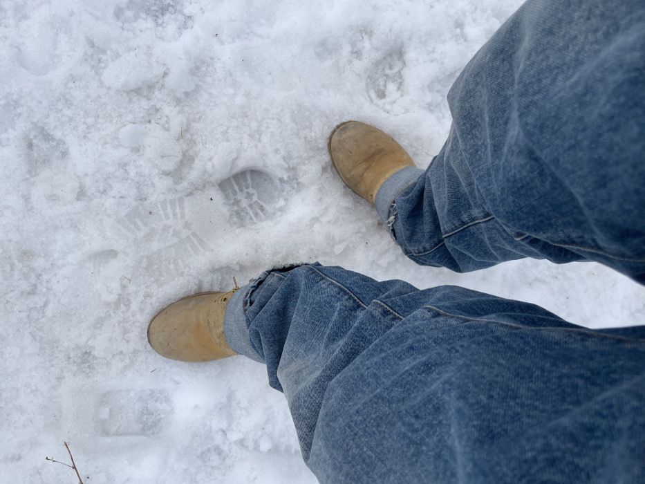 The scene depicts a first-person view looking down at the lower extremities of an individual standing in snow, located in La Salle-les-Alpes, France. The subject wears blue denim jeans, which are slightly faded and exhibit frayed cuffs around the ankles. Both feet are clad in tan-colored, laced ankle boots, with visible lacing detail on the left boot. The boots appear sturdy and suitable for winter conditions. The ground is uniformly covered in white snow, displaying a granular texture. Multiple boot prints are distinctly visible in the snow, featuring a ridged sole pattern, indicative of prior ambulation. A small, bare twig or branch protrudes from the snow in the upper left portion of the frame. The lighting is diffused, suggesting daylight conditions. No other persons or specific objects are present within the captured view.